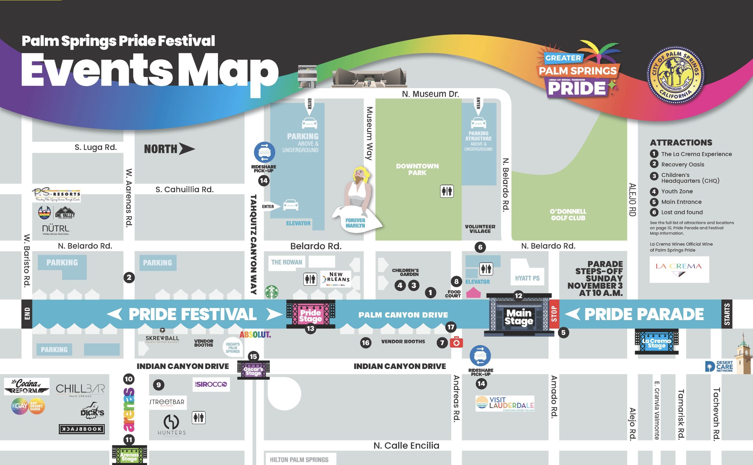 Download the Palm Springs Pride Festival and Parade Map to see where it all happens, from the Pride Parade start and end points, the Pride Festival along Palm Canyon Drive, entertainment stages including the Main Stage, La Crema Stage, Pride Stage, Oscar’s Stage, and Arenas Stage! [Download Here]